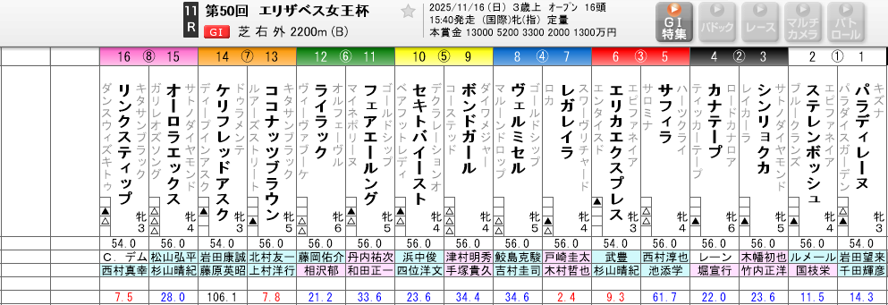見立て:キーワードは「色」。その中で各世代を通じて、牝馬クラシック路線で活躍した馬に「分」があるレース。対象は1、2、6、9、16号馬の5頭。それぞれに549を入れて1着候補に相応しい配列を貰った馬を有力馬として検討します。