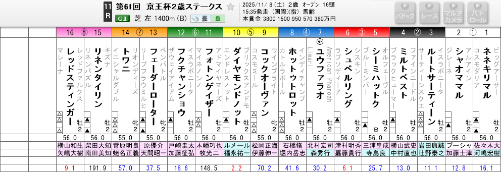 2着型:10ダイヤモンドノット、16レッドスティンガー