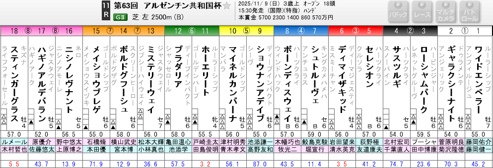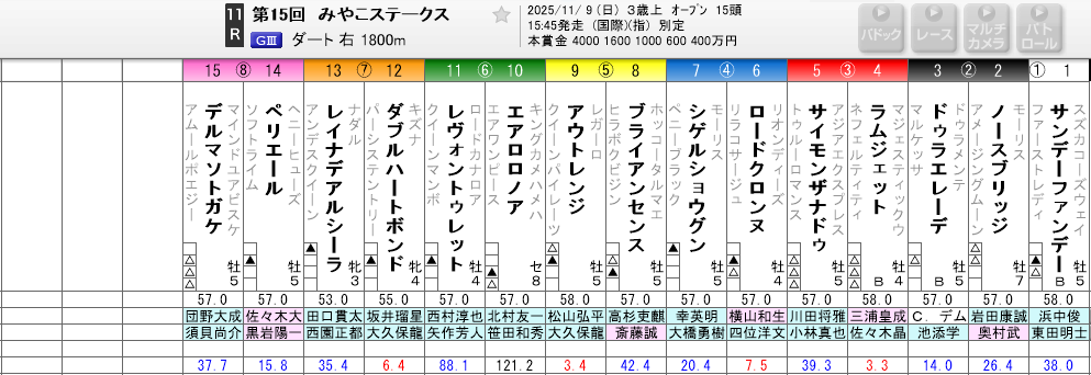 見立て:本レースでJRAの想いを最も体現しているのが13レイナデアルシール(田口貫太・西園正都)。同馬は目下(逃げて)3連勝中でこのレースが昇級初戦。直前走が牝馬限定戦での勝ち上がりを考慮すると、G3の混合戦で何処まで通用するかといわれれば「?」。今回も逃げの一手だろうから稍重馬場が味方すれば穴をあける可能性も無きにしも非ずならば1着、3着での押さえが順当なところか。