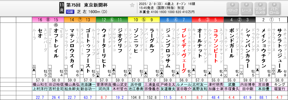 見立て:最初に昨年の勝ち馬1サクラトゥジュールの連覇の有無について・・連覇してもいいような配列になっていますが基本要素が見当たらないので昨年勝ち馬の指定席でもある3着候補馬に留めておくのが妥当かと。