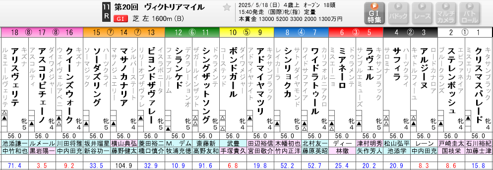 見立て:舞台である東京千六で良績のある馬…2ステレンボッシュ、4サフィラ、5ラヴェル、8シンリョクカ、10ボンドガール、13ビヨンドヴァレー、16クイーンズウォーク、17アスコリピチェーノ、18アリスヴェルテ